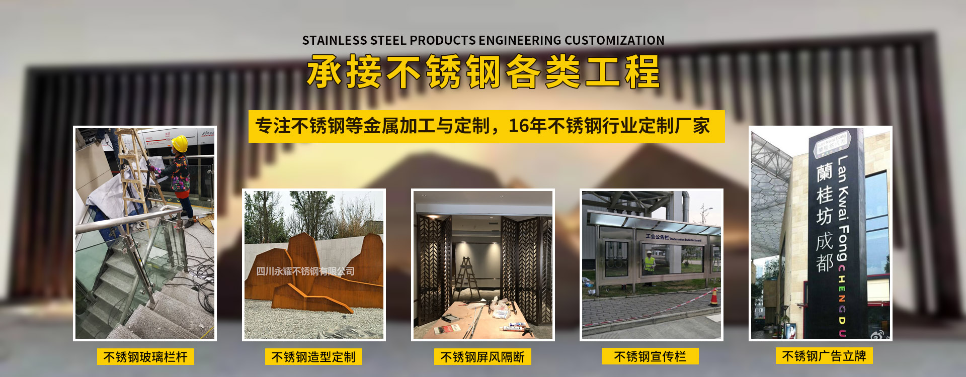 四川永耀不銹鋼有限公司是一家集開(kāi)發(fā)、設(shè)計(jì)、加工、制作、安裝、并承接各種不銹鋼工程為一體的綜合性企業(yè)。多年來(lái)一直在專注于不銹鋼等金屬的加工與研發(fā)。在客戶群體中贏得了良好的聲譽(yù),以專業(yè)專注的精神,致辭力于打造良好的產(chǎn)品和企業(yè)形象,對(duì)每一產(chǎn)品傾注全力,力爭(zhēng)每個(gè)細(xì)節(jié)精細(xì),確保產(chǎn)品具有優(yōu)越的性能,優(yōu)美的外觀及優(yōu)良的品質(zhì),使公司產(chǎn)品深受廣大用戶的親睞。 本公司主要業(yè)務(wù): 一、工程類 承攬:酒店、銀行、商鋪、寫字樓、公寓、城鐵、地鐵、公交、機(jī)關(guān)、 學(xué)校、廣場(chǎng)藝術(shù)雕塑、自動(dòng)門、旋轉(zhuǎn)門、廣告欄、公